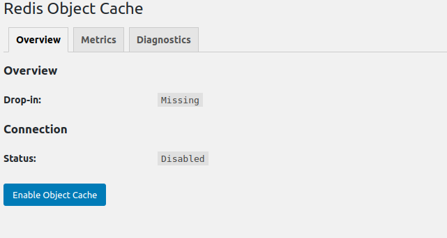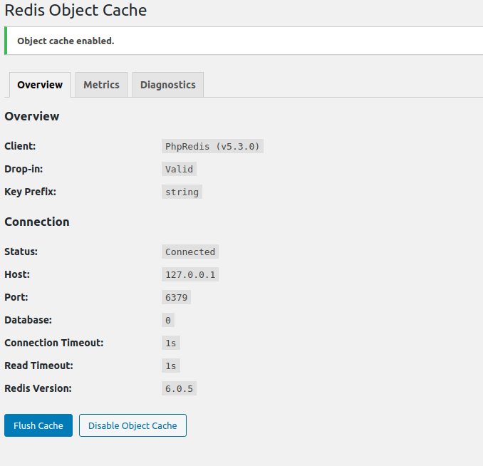 - Go the Wp-Admin area of wordpress and click the “Object Cache” button.